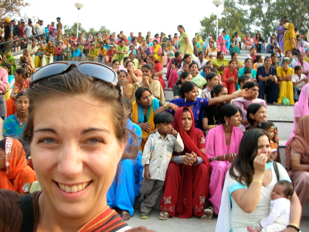 La cérémonie débute à 17h00, le lieu est apparemment bondé tous les soirs et nous voulons s’assurer une place de choix! Nous arrivons devant une foule complètement endiablée. Les estrades deborde d’indiens qui chantent et qui dansent, l’esprit est à la fête, un délire coloré par les centaines de saris et par la blancheur des sourires. Bref, un délice pour les yeux et il y a à peine quelques minutes que nous sommes là! Le spectacle se fait attendre et pendant ce temps on brandit les drapeaux indiens de toute part, la foule est de plus en plus enflammée.