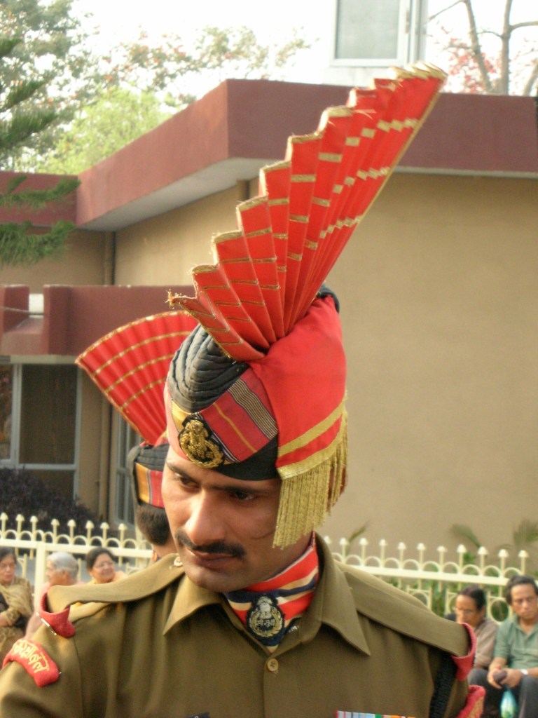 On peut apercevoir l’animation du côté pakistanais, qui arbore fièrement la couleur de sa patrie. À la frontière même, on remarque les deux drapeaux qui volent au vent, côte à côte, haut dans le ciel. Et c’est partie… les deux pays s’affrontent dans une marche militaire d’une incroyable synchronicité. Leurs habits contribuent largement au côté spectaculaire de l’impressionnante cérémonie quotidienne. Tout cela se termine avec la descente des drapeaux respectifs et avec un bouchon de circulation monstre! Demain, à la même heure, la même fête, le même enthousiasme, bref, le même scénario prendra forme ici à la limite du Pakistan et de l’Inde.