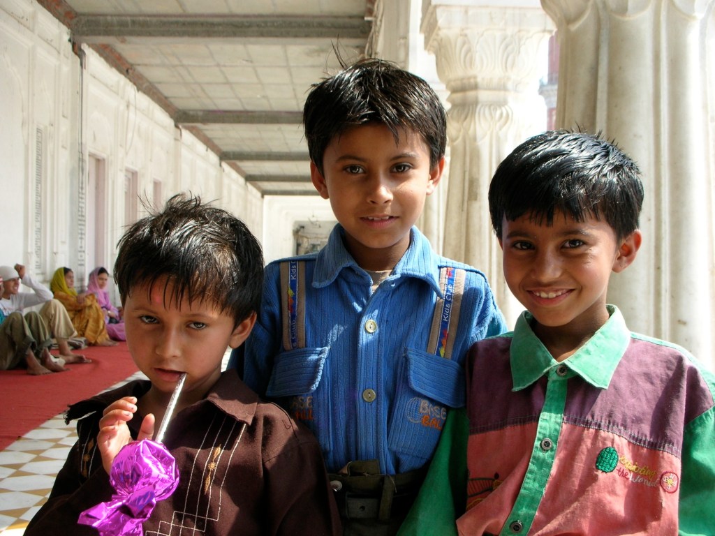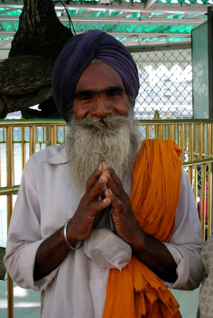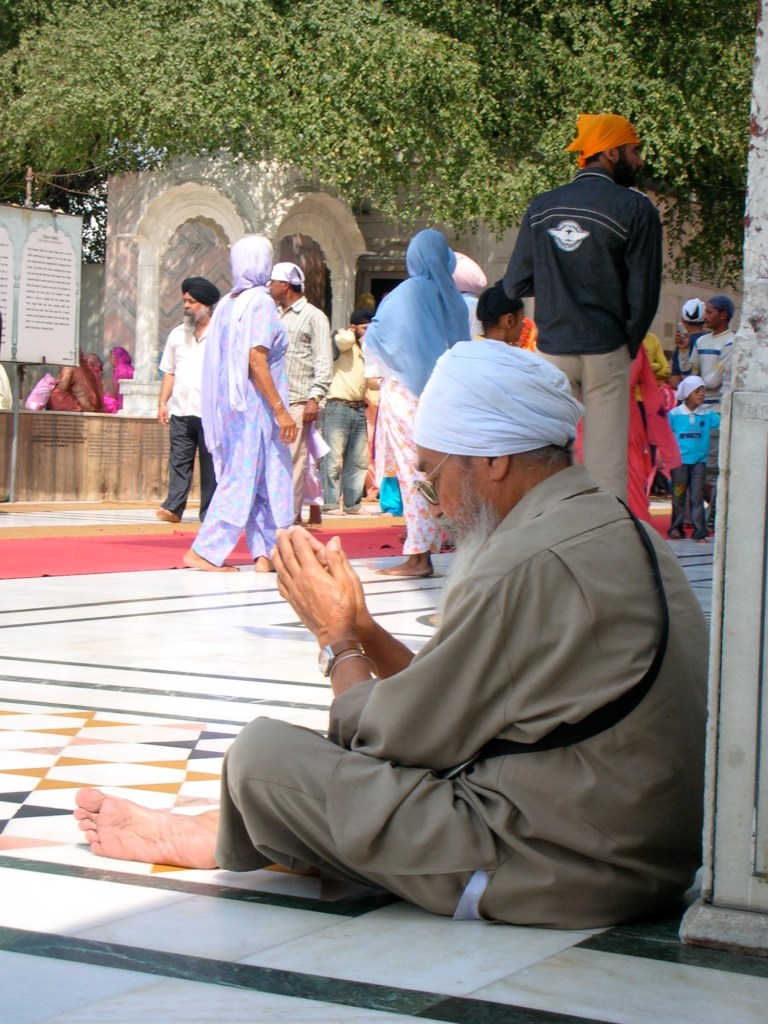 Nous sommes à peine entrés dans le temple, qu’un vieil homme Sikh, à la barbe longue et blanche et au cheveu couvert pour l’occasion nous arrête!(dans plusieurs temples la tête doit être couverte en signe de respect). Avec la plus belle candeur au monde, il nous entretient pendant une vingtaine de minutes sous un soleil de plomb. Son visage bienvaillant ruisselle de sueur et ses yeux confirment un esprit rigoureux. Les premiers mots qu’il nous adresse en anglais sont très difficiles à comprendre étant donné le fort accent hindi, mais peu à peu, il prend de l’assurance et tout devient beaucoup plus clair. Nos propos tournent autour de son garcon, de nos familles et même de nos lointains ancêtres européens qui franchirent l’océan à la conquête du nouveau monde: l’Amérique. Nous lui parlons de notre grand pays sans pollution, remplit d’eau et d’air pure. Il nous parle de l’endroit où il vit; dans la campagne, près d’Amritsar, avec les animaux de la ferme. Une main sur le coeur et l’autre sur le front en signe de respect, il nous envoie la bénédiction de notre dieu: « Christ bless you! » Nous le bénissons à notre tour avec le sien: « Guru Nanak* bless you! » Au Temple d’Or, le nom de ton dieu a peu d’importance, tout le monde trouve un coin pour rendre hommage à ses convictions.