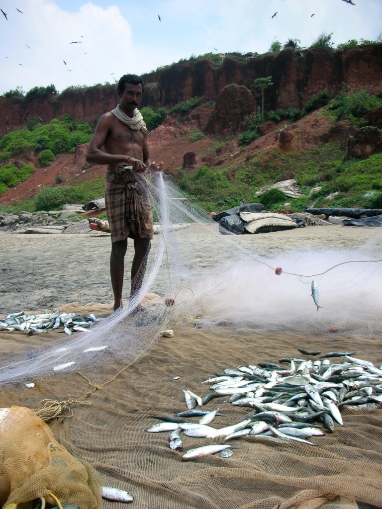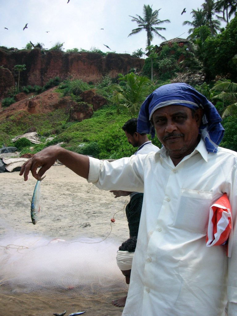 En bas, sur la plage, les pêcheurs trient la pêche de la nuit avant d’entreprendre la vente de leurs recoltes aux restaurateurs trop nombreux pour le peu de touristes présents. Des 18h00, les comptoirs à poissons abondent et la compétition est féroce. Barracuda, thon rouge, requin, merlin, crevettes géantes et calmars s’offrent à nous, à des prix ridiculement bas. Chaque vendeur nous chante son discours, mais nous nous laissons charmer par un personnage charismatique, qui remplit nos estomacs des plaisirs de la mer à chaque soir, pour ensuite aller contempler le ciel qui se déchire dans la lueur des éclairs. Un spectacle naturel qui nous suivra tout au long de notre découverte du Kerala.