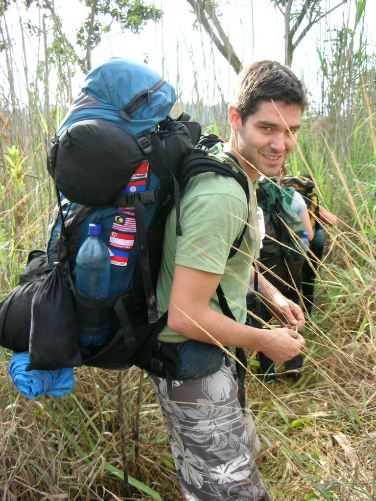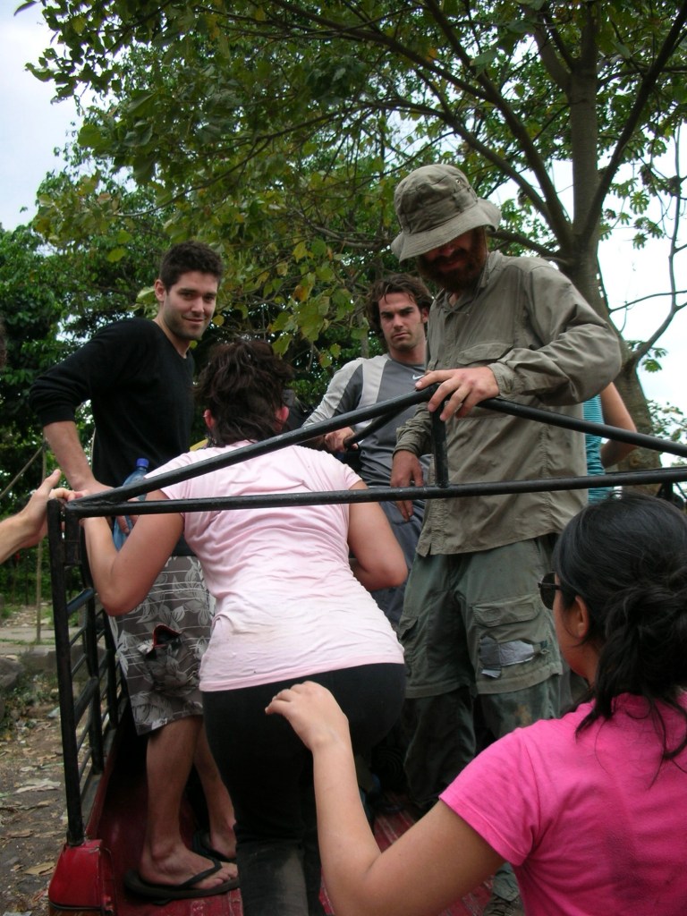 Après une brève description de chacun, nous débutons notre marche à travers les fincas* de bananes, de pacaya* et autres. Nous croisons plusieurs locaux durant la premiere heure, que nous laissons passer dans l’étroit chemin de terre dans lequel nous tentons d’évoluer sans s’enfarger dans nos bottines! Nos épaules pleurent déjà de la lourde charge que nous portons et nos corps perlent de sueur…il reste encore au moins 5 heures de randonnée avant d’arriver à notre camp de base. Nous nous arrêtons dans la jungle pour un léger dinner, ce qui redonne du moral aux troupes et surtout une dose d’énergie pour le dernier tiers, mais non le moindre. Tout va bien, nous tenons le rythme et le soleil est parmis nous, mais malheureusement pas pour très longtemps. Environ 15 minutes après le retour en piste, la pluie s’annonce. Quelques goutelettes qui nous indiquent clairement que nous devrions s’empresser d’enfiler les imperméables sur nos sac à dos. Et voilà, nous avons droit à une douche tropicale, bien qu’elle soit tout à fait hors-saison. Nous gardons le moral malgré que nous sommes ralentis par la pluie qui ne cesse en aucun temps d’augmenter en intensité.