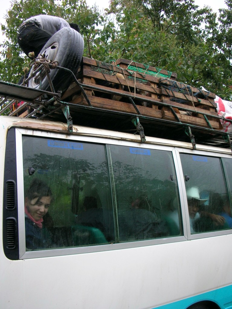 Une dernière nuit à la Casa Argentina, et voilà, il est temps de reprendre la route. Un taxi nous emmène au turbulent terminal Minerva, nous cherchons parmi les nombreux kiosques improvisés, quelque chose à se mettre sous la dent. Au menu: poulet frits, pan*, tamal*, etc… Ensuite nous abandonnons nos sacs sur le toit de l’autobus; direction Coban via Guatemala city. Pendant près de 3 heures nous avons l’impressions d’être à l’intérieur du dernier cri en matière de montagne russe. Nous passons de 2 300 à 3 000 mètres, nous sommes balancés de gauche à droite, nous devons nous accrocher fermement au siège d’en avant pour rester en place. L’autobus atteint des pointes d’au moins 100 kilomètres à l’heure, on échappe même une partie de la cargaison qui se trouvait sur le toit. On évite de justesse un camion citerne renversé sur le côté dans une des nombreuses courbes. On redescend de 1 000 mètres en quelques minutes, quasiment en chute libre! Nous sommes subjugués par l’attitude du conducteur mais nous sommes encore plus absorbés par le panorama surnaturel qui se déroule à toute vitesse devant nous, tel un un Imax 3D plus vrai que nature: surplomb vertigineux et volcans sont à l’honneur. Ce chauffeur est définitivement un peu trop audacieux et notre voisin de banc, pour sa part, digère difficilement les kilos de « peanuts » qu’il a ingurgités depuis le départ. Voilà qu’il régurgite sur son voisin… bienvenu dans les transports publiques du Guatemala. Enfin on apercoit les premiers signes de la capitale, nous nous arrêtons pour la nuit, une pause bien méritée avant de reprendre, au lever du soleil, la route vers Coban: point de départ de la région d’Alta Verapaz.