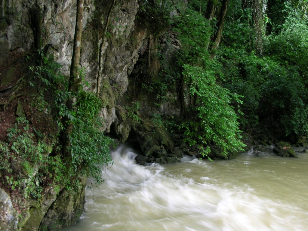 Nous voilà maintenant au beau milieu de la forêt humide, dans le plus que petit village de Lanquin à environ deux heures et demi de Coban. Une ville sans intérêts, qui est pour plusieurs, qu’un simple tremplin vers la région d’Alta Verapaz. Nous débarquons droit devant l’invitant site de El Retiro, un complexe situé au bord d’une rivière, avec ses huttes dispersées sur cet immense terrain, où tout a été pensé pour satisfaire autant les yeux que les papilles gustatives des voyageurs. À environ trente cinq minutes de marche, se trouve une merveille de la nature; Las grutas de Lanquin. Cette caverne de calcaire nous invite dans les entrailles de la terre sur une longue distance de 450 mètres qui nous permet d’admirer les fabuleuses stalagmites et stalactites qui habitent ce lieu mystérieux, grâce à un système d’éclairage disposé tout au long de ce demi kilomètre. L’endroit est à la fois lugubre et attirant. Les murs suintent d’eau saturée de calcaire, qui modifiera encore et encore le décor des lieux pour des millénaires. À la tombée du jour, assis à l’embouchure de la grotte, nous assistons au réveil des millions de chauves-souris qui sortent à coup de centaines. Étrangement, le spectacle est d’un silence incroyable. Ces petites créatures virvoltent dans tout les sens, mais en aucun cas, elles frôlent la vingtaine d’intrus venus s’émerveiller! Après plus d’une demi heures de contemplation, nous rebroussons chemin à la noirceur avec beaucoup moins d’aisance, que ces petites bêtes vivants dans les bas souterrains de la terre.