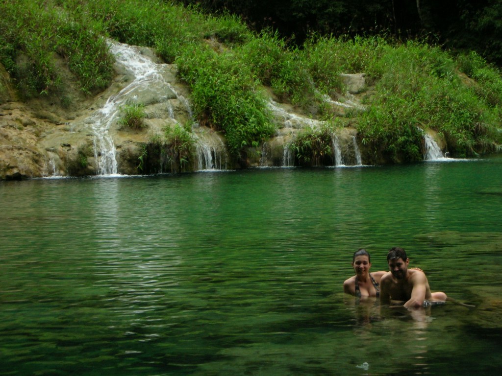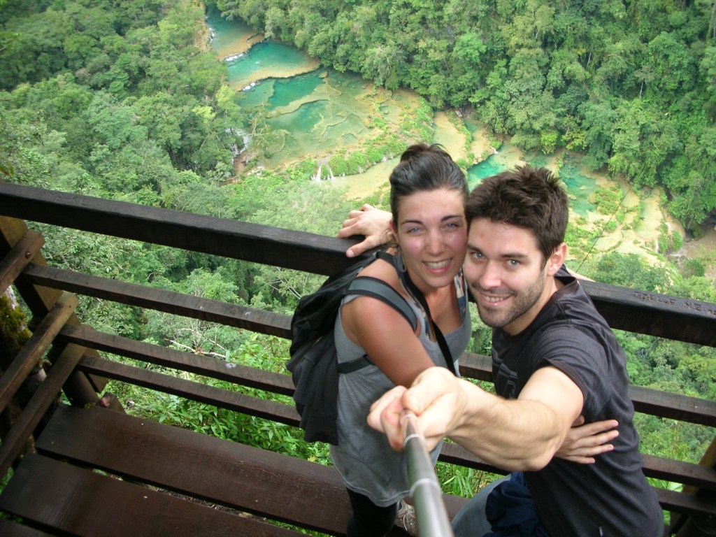 Dès le lendemain, toujours dans les alentours de Lanquin, nous repartons pour une autre aventure d’un jour à Semuc Champey: une attraction du pays qui s’affiche sur tout les itinéraires des touristes!!! En quoi consiste Semuc Champey? Et bien toujours grâce au calcaire, une autre beauté de la nature a vu le jour. Sur un bref 350 mètres, le fond de la rivière Cahabòn est tapissé de ce minéral, formant plusieurs bassins et donnant à l’eau un aspect iréel. Suite à un pic-nique bien mérité au mirador* du parc et bien-sûr, suite à une baignade rafraîchissante dans ces magnifiques lagunes, nous retournons au stationnement pour y retrouver notre conducteur.