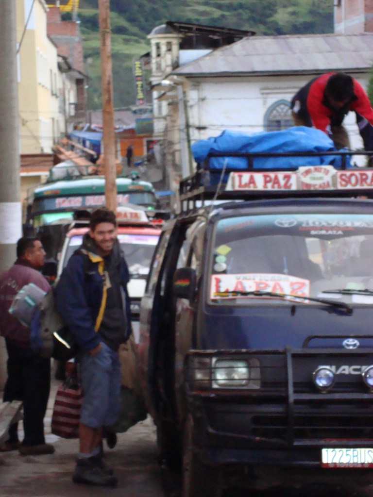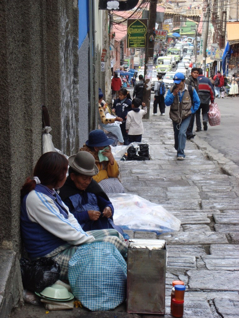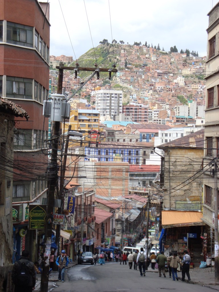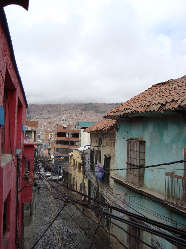 À l’approche de la Paz, par la route de El Alto*, on a subitement l’impression de voir la fenêtre de notre bus se transformer en hublot d’avion. À 500 mètres au dessus de la capitale la plus haute du monde, comme en vol plané, nous descendons rapidement dans le canyon au flanc tapissé de bâtiments couleur terracotta. La capitale est charmante, ses rues pavés à la manière inca bouillonnent de circulation automobile et piétonnière. Elle dégage l’atmosphère d’un grand village acceuillant plus qu’une cité surexploitée. Pour nous, il est temps d’ajouter quelques couches d’alpaca à notre garde-robe qui résiste difficilement au rigueur du climat bolivien. Nous nous laissons tenter par les attraits culinaires de la capitale: un « whooper » chez le roi du burger, un plateau de sushi accompagné d’un bon verre de blanc chilien abordable, un poulet tikka masala passable, une soupe thaï qui n’a que le nom de thaïlandais et une pizza new-yorkaise douteuse… suivi de fièvre et diahrrée. Oupss!!! finalement peut-être un peu plus douteuse que nous l’avions crû.