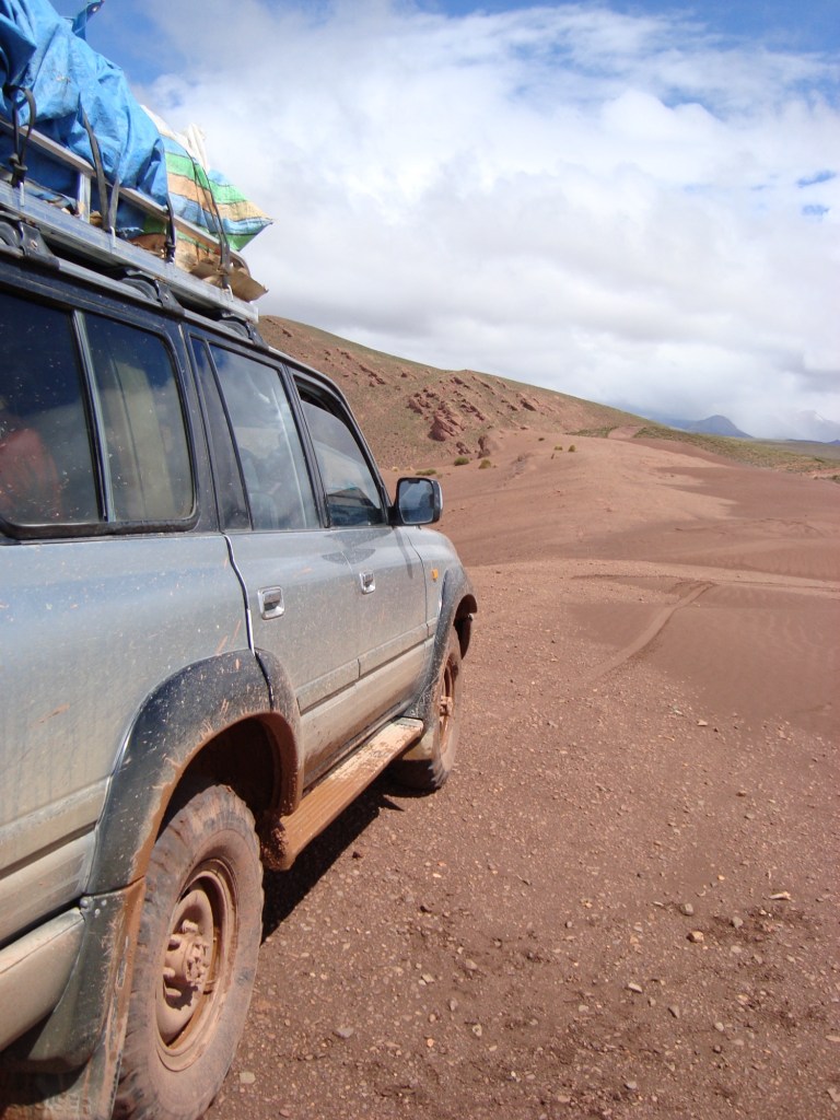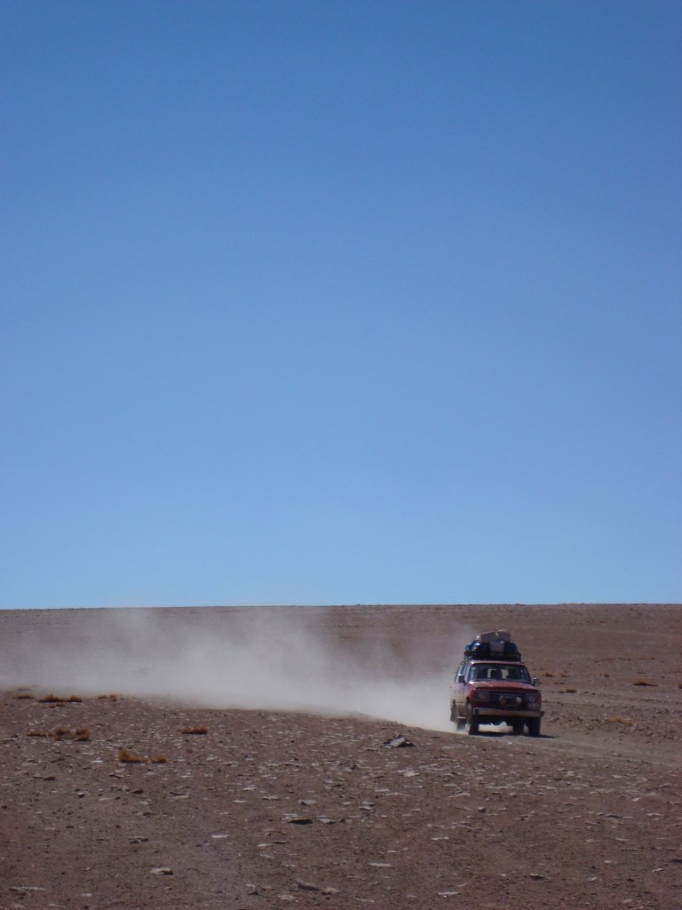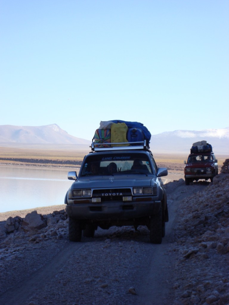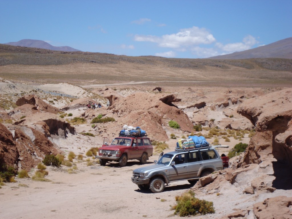 8h30 am, fidèles au poste, nous rencontrons Jamie et Rachel, deux anglais fort symphatiques, qui se joignent à nous pour l’excursion. Nous rencontrons également William et sa mamá Thalia de son nom touristique, notre guide et notre cuisinière pour les quatres prochains jours dans un circuit au sud-ouest de la Bolivie. Nous prenons soin de bien attacher nos sacs à dos sur le toit du véhicule, qui sont devenus depuis plusieurs mois, toute notre vie, nous aidons mamá à insérer la tonne de nourriture à l’arrière de la jeep, pendant que William fait les dernières vérifications de routine sur la carosserie. Et c’est un grand départ!