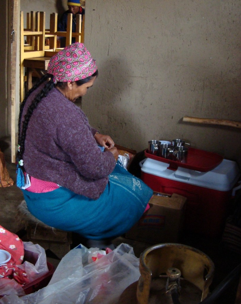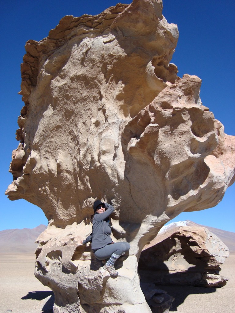 Nous prenons donc quelques clichés de ces drôles de pierres aux allures d’arbres, que le temps et le vent ont faconnés. Thalia (mamá), grimpe sur les rochers et pose pour nous dans son habit traditionel et ses deux longues tresses ornées de ponpons, que l’on voit chez presque toutes les femmes andines du pays!