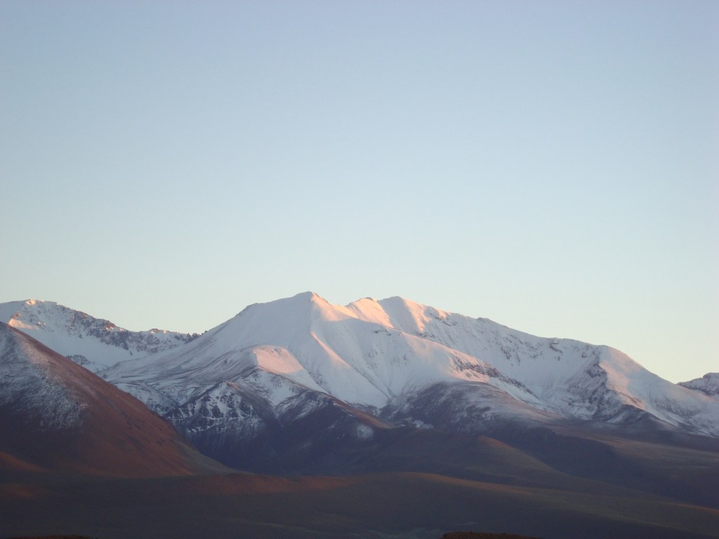 5h30 am, il fait maintenant chaud à l’intérieur de nos sacs de couchage, mais c’est déjà l’heure de rouler ceux-ci, d’enfiler ses chaussures, ses gants, sa tuque, ses 36 chandails (disons 4!!!), d’avaler un maté de coca et finalement de filer à toute allure, pour assister au levé du soleil. Ses rayons sont loin d’être suffisant pour nous réchauffer, mais éclairent merveilleusement la montagne blanche à nos côtés.