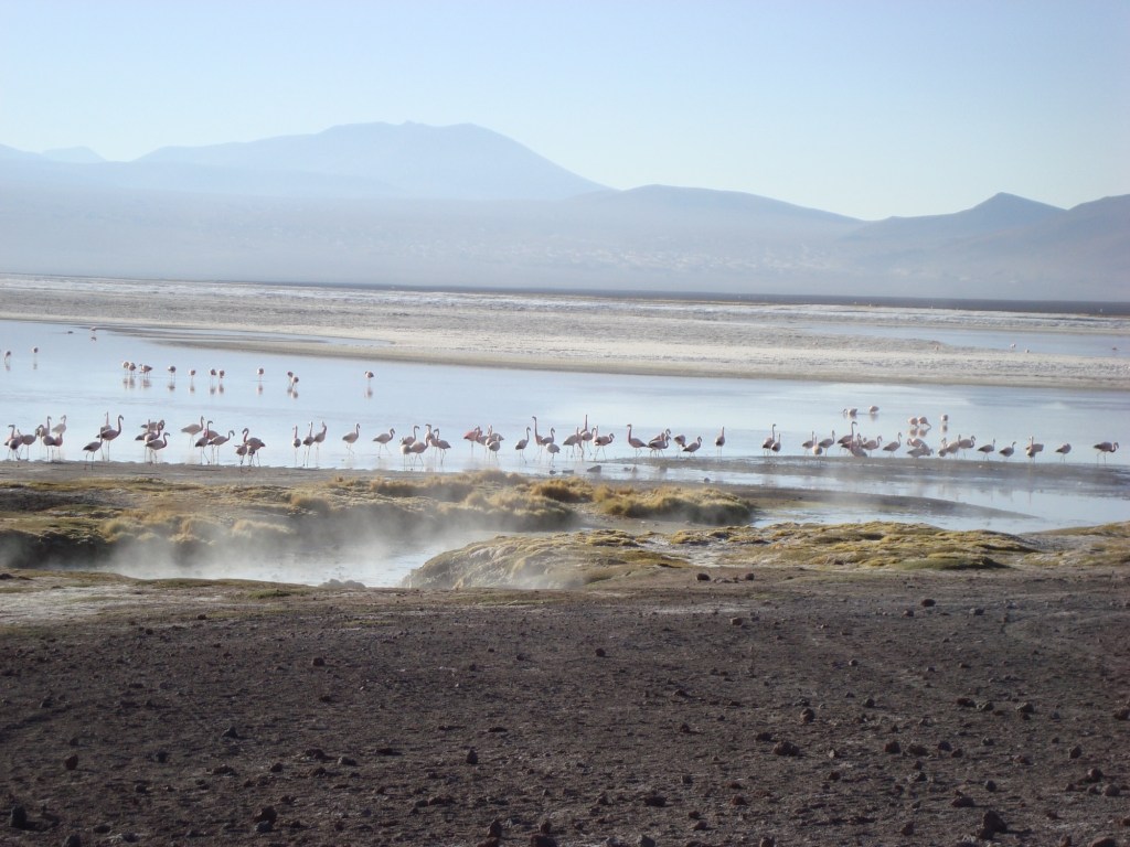 Ce matin, on nous accorde une petite heure de plus de sommeil. Difficile de ce sortir de ses rêves, mais la bonne odeurs des crêpes de mamá nous donne un bon coup de pouce! Même rituel; on s’habille chaudement, on attache les sacs sur le toît, William inspecte le véhicule et mamá court dans tout les sens. Nous partons pour une troisième journée vers la découverte de sites extraordinaires. À la première lueur du jour, la jeep se stationne devant se lac à la couleur du sang auquel les nombreux flamants roses sont parfaitement assortis. Mais pourquoi la Laguna Colorado est si rouge? Cette fois-ci, ce n’est pas les nombreux minéraux de la région qui en sont la cause, mais plutôt l’énorme quantité d’algues, dont se nourrissent d’ailleurs ces fabuleux oiseaux roses, qui lui offrent une teinte toute particulière.