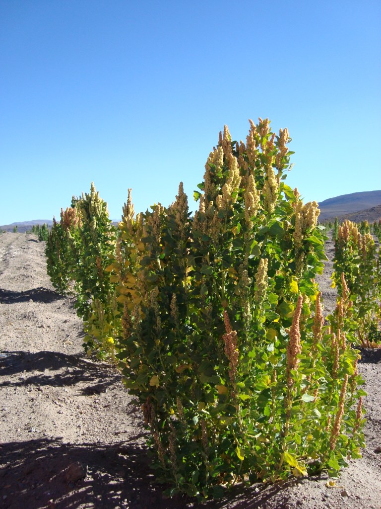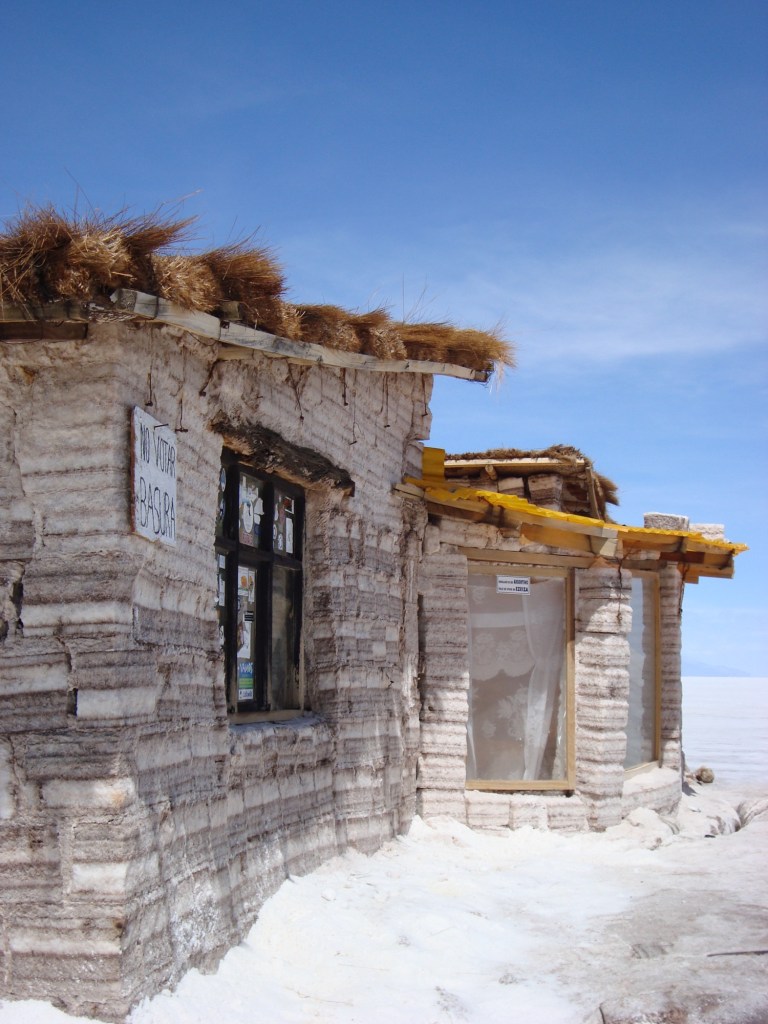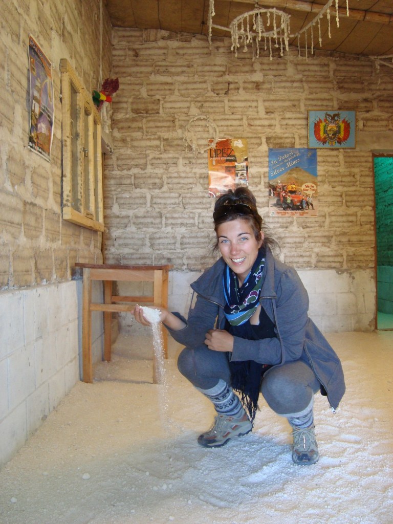 Finalement, après la visite de champs gigantesques de quinoa (ceux qui nous connaissent, savent que nous en sommes fous!), nous aboutissons cette fois dans un hôtel de sel!!! Les murs sont constitués de briques de sel solide, les chaises et les bases de lits aussi, mais le plus amusant est de fouler le sol de gros sel. Surpris et survoltés, nous épuisons nos caméras à force de photographier le lieu situé aux abords du plus grand désert de sel au monde, qui reste malgré tout encore difficile à distinguer! Marie devra attendre au petit matin pour enfin voir le fameux Salar de Uyuni!!! Un autre savoureux, mais surtout brûlant repas de mamá Thalia autour d’une table de sel en discutant de plusieurs facettes du pays avec William, le temps que nos batteries se rechargent. Épuisés, nous allons tous nous blottir dans nos confortables lits, bien au chaud entre les murs de sel!
