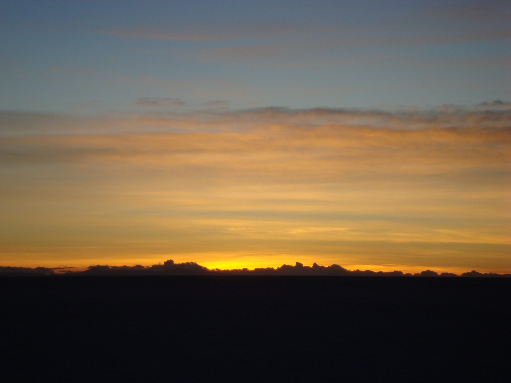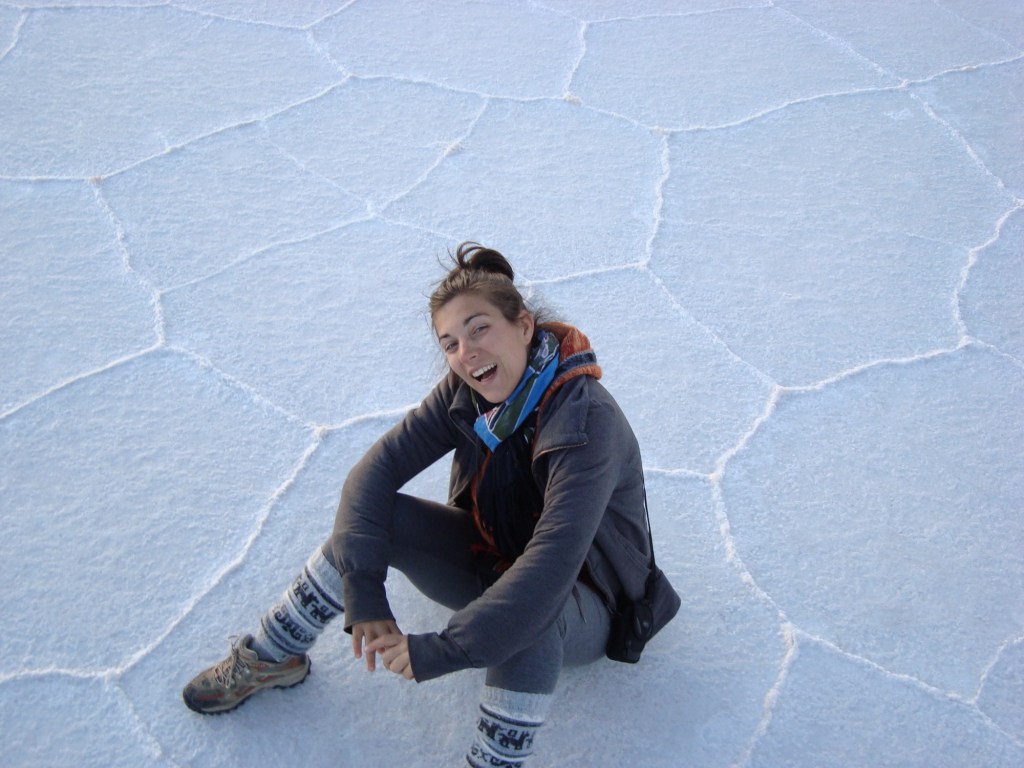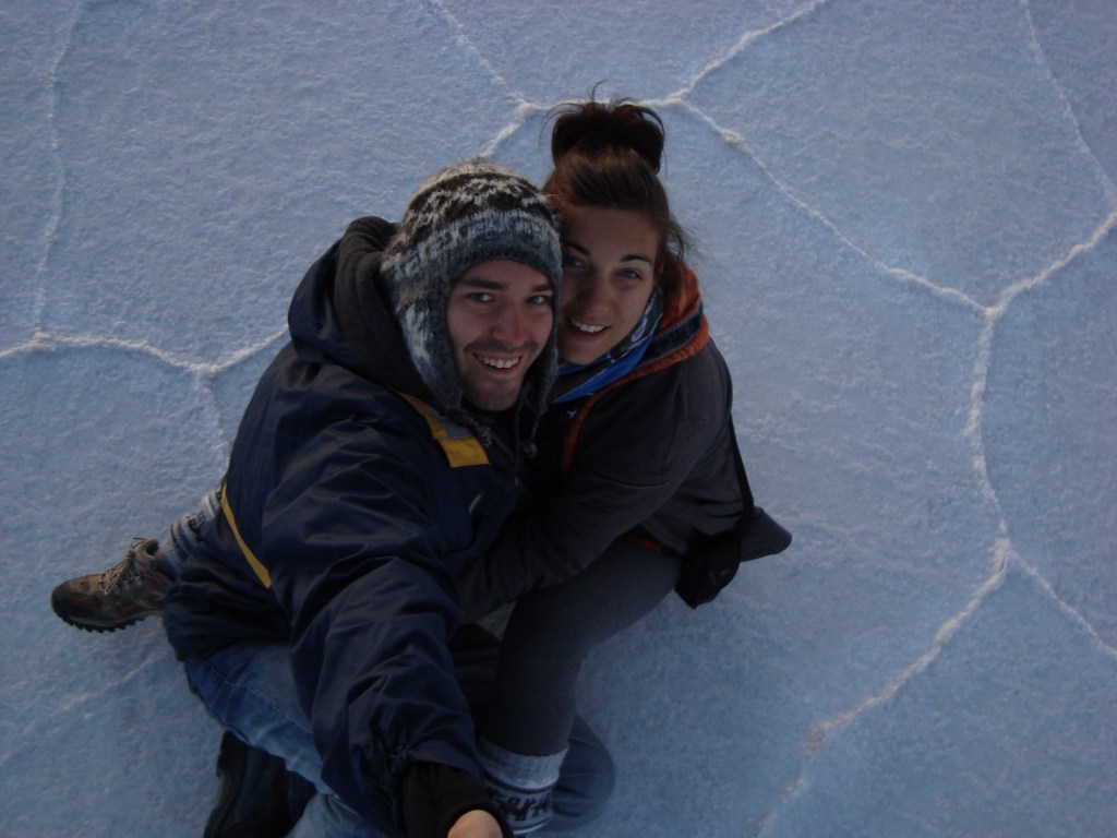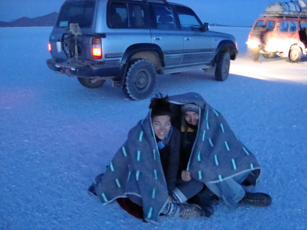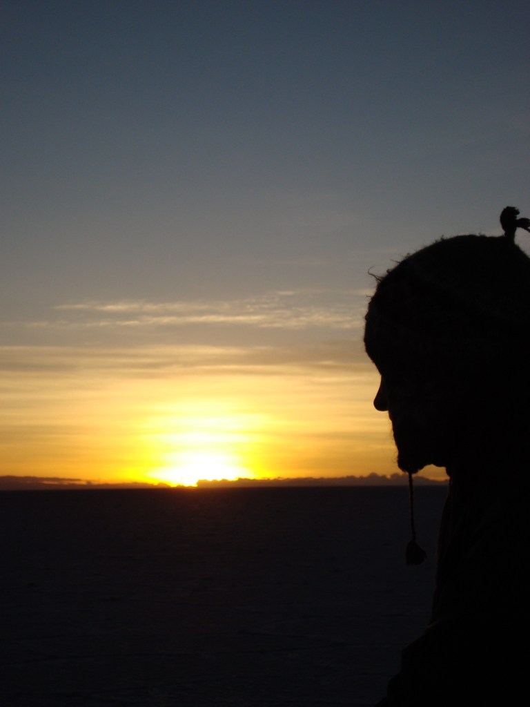 Pendant que les deux conducteurs et amis règlent le « léger » inconvénient, nous observons la salida del dol* au dessus du Salar de Uyuni (Marie: Ça y est, j’y suis, le sel craque sous mes souliers!). Sa blancheur se dévoile au fur et à mesure, jusqu’à la présence complète de Galarneau*. C’est à si méprendre, on jurerait être au beau milieu de l’Arctique. L’endroit est d’une beauté qui s’étire à l’infini, et il y a ces étranges formes scultant le sol, qui ajoutent au mystère du lieu. Pachamama* a définitivement jeté son dévolu sur cette parcelle du monde!