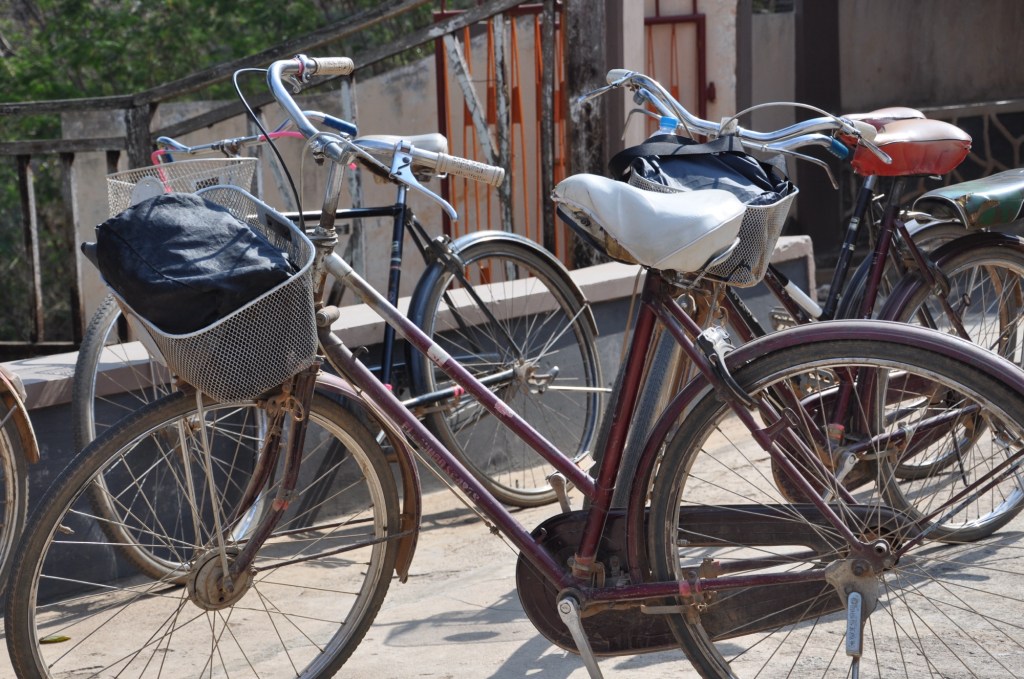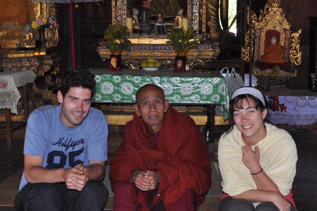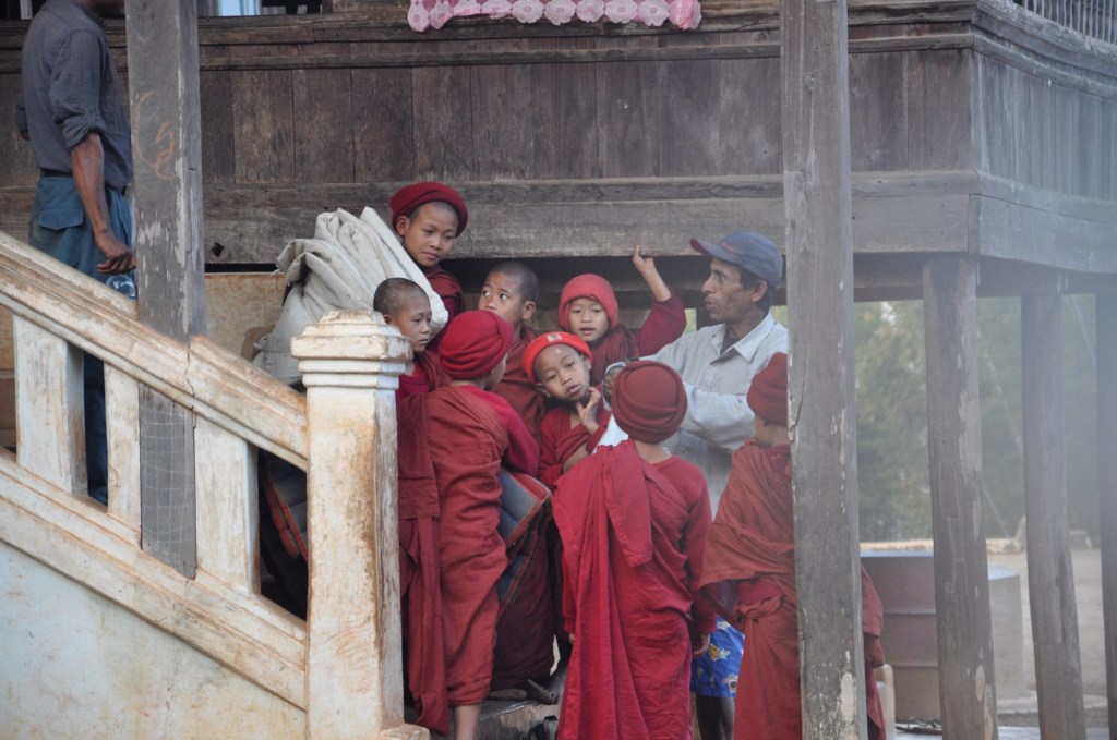 10h00 du matin, nous empruntons alors une bicyclette et partons à la rencontre des villageois. La découverte du Myanmar, c’est avant tout la rencontre de son peuple. Nous nous arrêtons devant un monastère qui semble au premier abord abandonné. Fidèle à son habitude notre vieux loup de mer Antonio entre le premier. Un moine sympathique nous y accueille. C’est comme si il nous attendait. Il nous sert croustilles de riz, gâteaux secs et oranges fraiches. « Come mucho, come mucho! »(mangez beaucoup), nous dit-il. N’allez pas croire que les moines sont tous aussi accueillant, mais celui-ci adore vraisemblablement avoir de la compagnie. Une particularité semble toutefois commune à tous les moines rencontrés: ils sont instruits et très informés sur le monde. Dans un anglais approximatif parsemé de phrases espagnols et parfois même françaises, il nous entretient sur les liens politiques et économiques de son pays avec la Corée, la Chine et le Bangladesh. Nous épluchons rapidement les sujets de l’heure: le premier président afro-américain des USA, les ravages du récent tremblement de terre en Haïti, l’évident réchauffement climatique, etc… Subitement, le lama coure dans tous les sens à la recherche de son album photo poussiéreux. On le voit toujours aussi bienveillant, sur certaines photos très jeunes et sur d’autres, un peu plus agé! Nous prenons finalement tous des photos en sa compagnie et même une de lui que nous prendrons soin de lui faire parvenir pour ajouter à son album, il a maintenant 65 ans. « Sans aucun doute, voici à quoi j’aimerais ressembler si la Vie me permet d’atteindre cette age vénérable. » Nous reprenons les guidons usés de notre bicyclette et fonçons tel « 6 ninos locos » à travers la campagne de Inle. Tantôt assis devant un repas a 1$, tantôt à bavarder avec les gens rencontrés sur notre route et tantôt au sommet d’une colline qui nous dévoile une vue aérienne impressionnante du secteur.