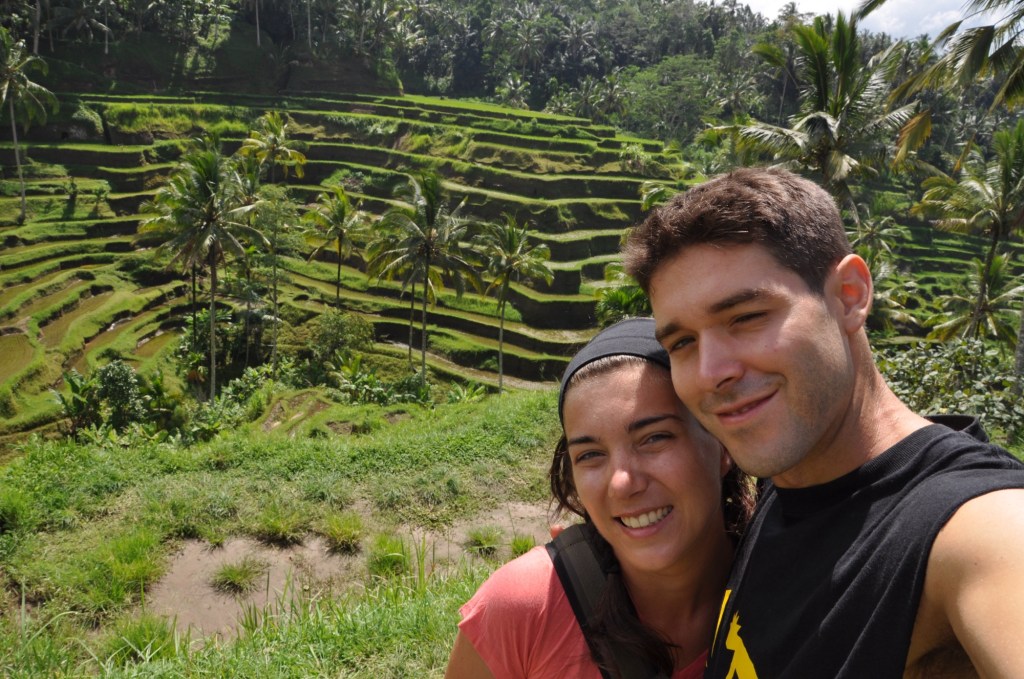 13 février! Nous débutons donc, notre découverte, au sud de l’ile, à Seminyak. Un endroit ou se succèdent hôtels luxueux, restos chics et boutiques de renommée mondiale tel que Dolce Gabana. Il y a le claquement des talons hauts de la clientèle trop huppée pour sourire et il y a nous!!! Avec nos quelques 500 000 roupiah quotidien, nos gougounes de caoutchouc, nos sacs a dos poussiéreux et nos vêtements décontractés, on jure définitivement dans le tableau! Nous y restons qu’une seule nuit! Au petit matin, nous profitons du déjeuner inclus (hihihi!), avant de filer à une heure au nord, dans la ville de Ubud, ou nous établissons notre camp de base pour la durée totale de notre séjour à Bali.