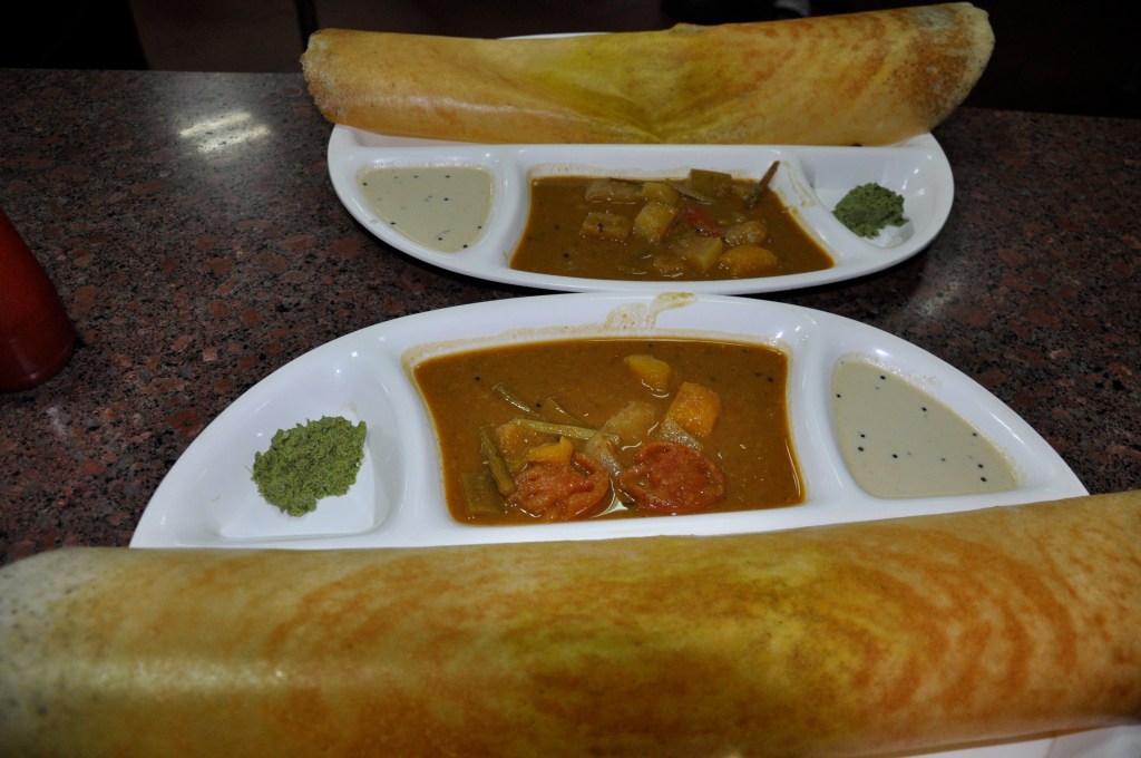 –Masala dosa: Une crêpe de farine de lentille, farci aux pomme de terre et mélange d’épice.