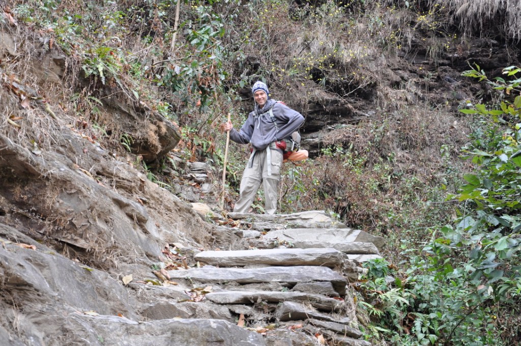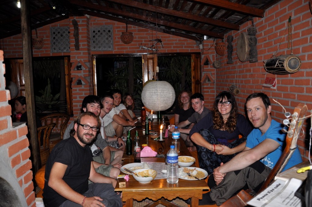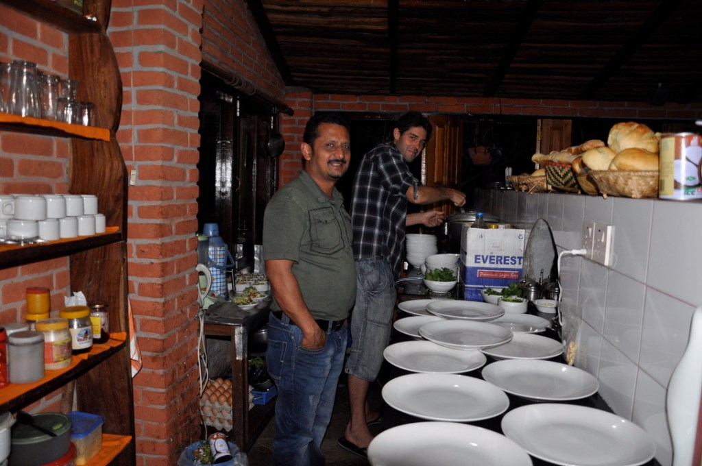 Quelques jours après notre arrivée, toujours dans les nuages, nous entrons par hasard au « Peace Eye guest house » pour prendre une bouchée. Cet acte simple et banal change alors radicalement notre vision et le parcours des prochains jours! Nous rencontrons d’abord Anna, une jeune coréenne amoureuse de la France ou plutôt de tout ce qui est français. Et puis Jack, un néo-zélandais dans la cinquantaine, lui, amoureux de la faune, travaillant d’ailleurs sur un fantastique projet visant à protéger la population mondiale de tigres et ayant élu domicile dans ce charmant petit « guest house » familial. Et finalement le proprio, Chiran, tant qu’à lui tout simplement amoureux de la cuisine. Tout en cuisinant, éclairé à la bougie, il nous fait part de sa passion culinaire. De fil en aiguille, ce fameux trio développe sur le sujet de la randonnée et réussit à nous vendre l’idée de partir sur les sentiers de l’Annapurna, sans guide, ni porteur!