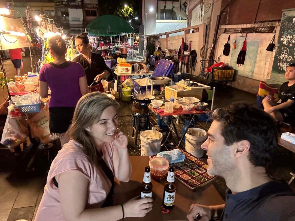 Après 21 heures et quelque poussières, épuisés, mais encore plus fébriles nous arrivons enfin dans le quartier touristique de la méga-métropole, il est 3 heures du matin, mais on ne peut s’empêcher de s’imprégner de l’énergie animée de l’énigmatique rue Khao San. Même au beau milieu de la nuit, Khao San road est en vie, des échoppes de nouilles à tous les 100 mètres, des vendeurs itinérants tentant de te vendre l’invendable, mais sans trop de persistance. Les vendeurs d’insectes frits comme les scorpions, les araignées et autres, reste encore à ce jour une image percutante et amusante et ce, même après tant d’années…bref, nous profitons de la belle Bangkok, bière à la main, un pad thai bien relevé. Bonne nuit Bangkok!