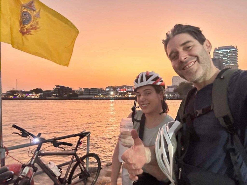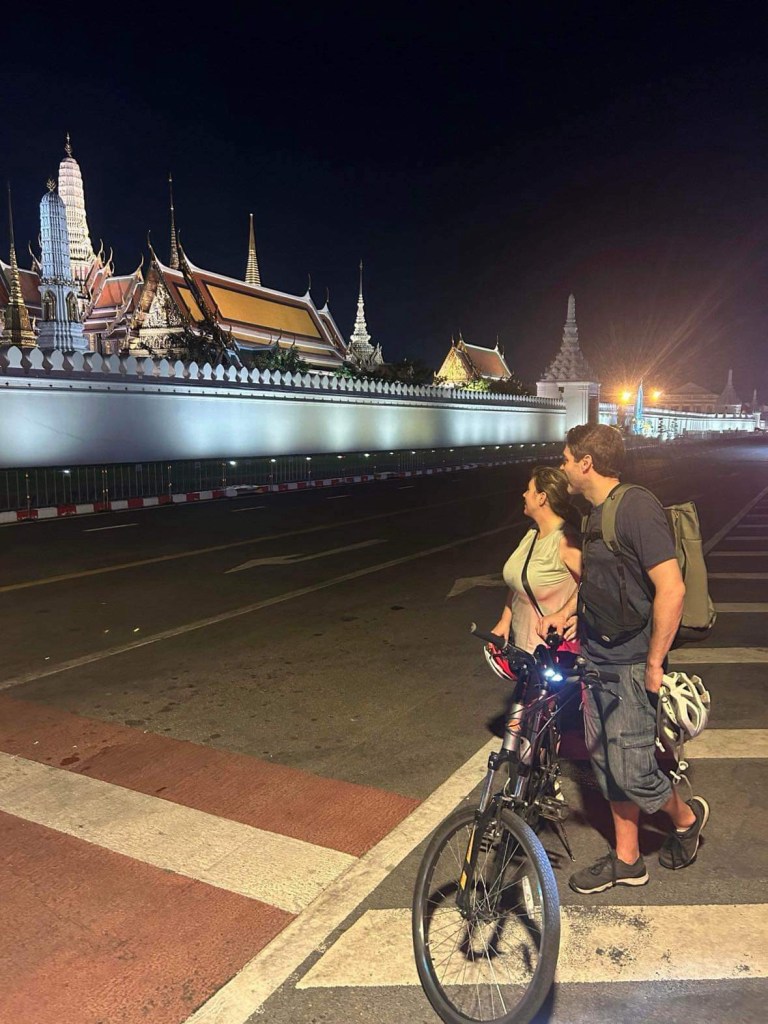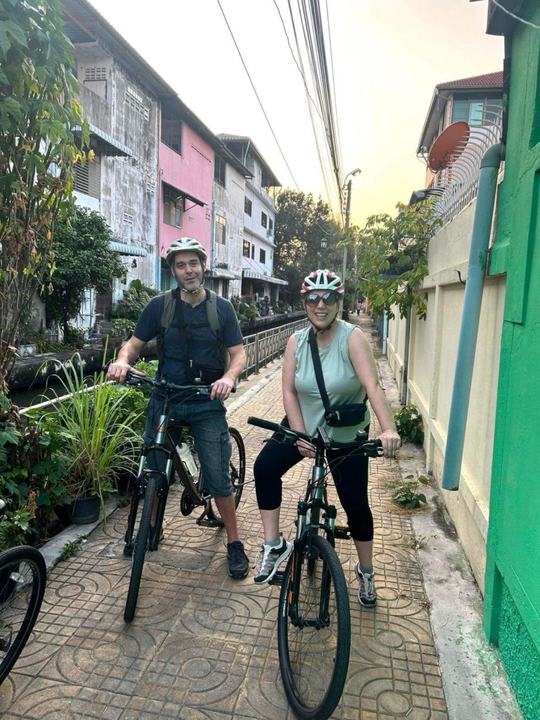Nous avons parcouru avec Tammy, une quinzaine de km dans la cité et les ruelles labyrinthiques de la gigantesque ville de 12 millions d’habitants! Nous traversons quelques zones bondées de tuyaux d’échappement mais la ballade se fait principalement à l’écart du brouhaha parfois même à travers les Soi (petites ruelles étroites), et les Klong (réseau fluvial). La brise est bonne, la ville est charmante, les gens sont souriants bref la ballade est au-dessus de nos attentes!