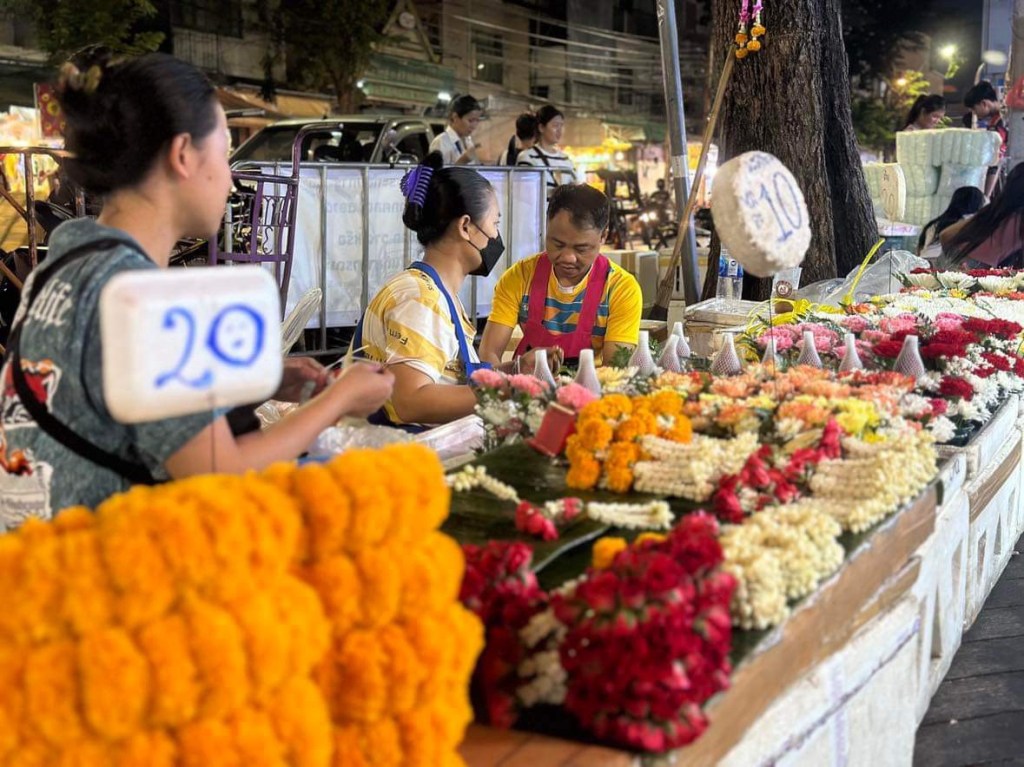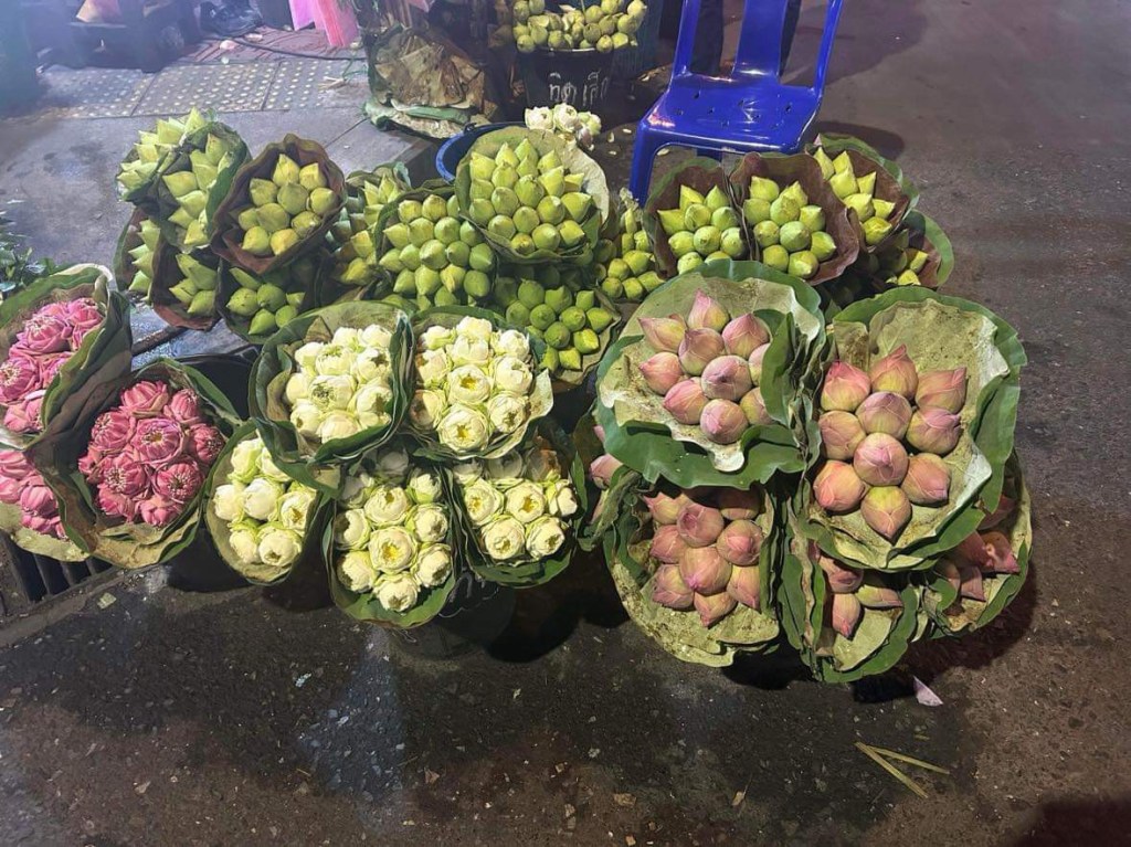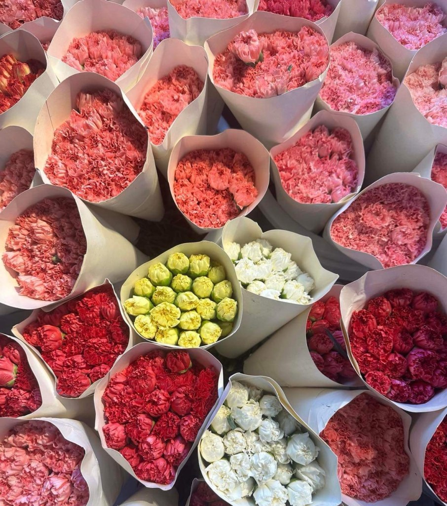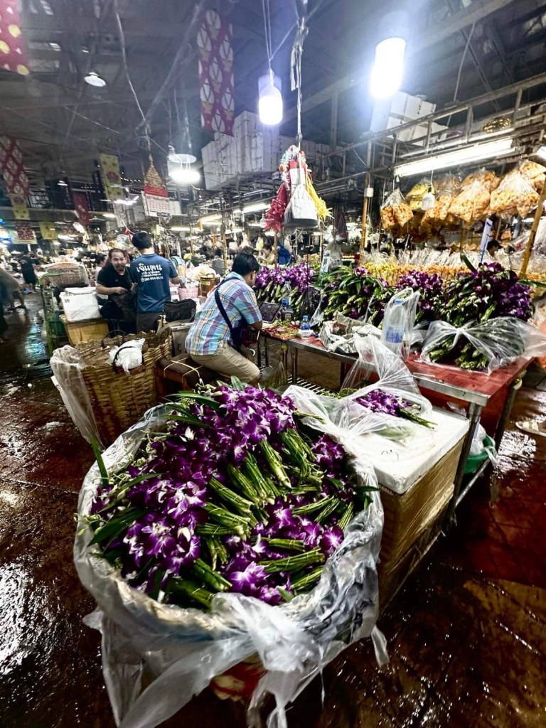 Chemin faisant, nous croisons les temples iconiques de Bangkok: le Wat Pho (Le Bouddha couché), le Wat Phra Kaew (le Bouddha d’émeraude), le Wat Arun (Le temple du soleil levant) et l’incontournable Palais Royale qui représente la résidence du respecté roi de Thaïlande (Rama X). Il règne soudainement autour des temples de la ville, un silence complet qui contraste avec le reste de la métropole: aucune voiture, aucune vidéo, photo sont tolérées. Toujours à vélo, nous roulons à travers les différents marchés, l’expérience est enivrante! Parmi ceux-ci, l’un des plus grands marchés de fleurs de l’Asie du Sud-Est, un gigantesque agglomérat de vendeurs qui exposent, toutes les nuits, une variété de fleurs indigènes: orchidées, marigold, lotus, frangipanier pour ne nommer que ceux-ci. Une courte traversée sur la célèbre rivière Chao Praya, nous mène de l’autre côté de la rive, dans les quartiers des différentes communautés musulmanes, chrétiennes, hindous, portugaises, françaises, chinoises et bien d’autres, qui relèvent jour après jour, depuis longtemps déjà, le pari périlleux du mixte des cultures sur un territoire limité.