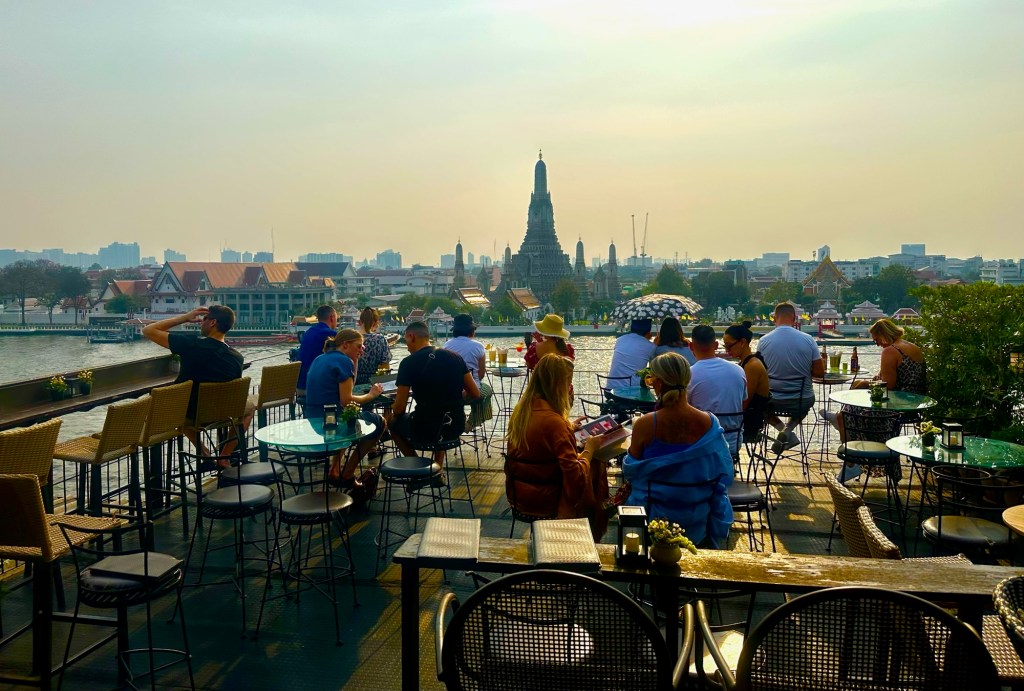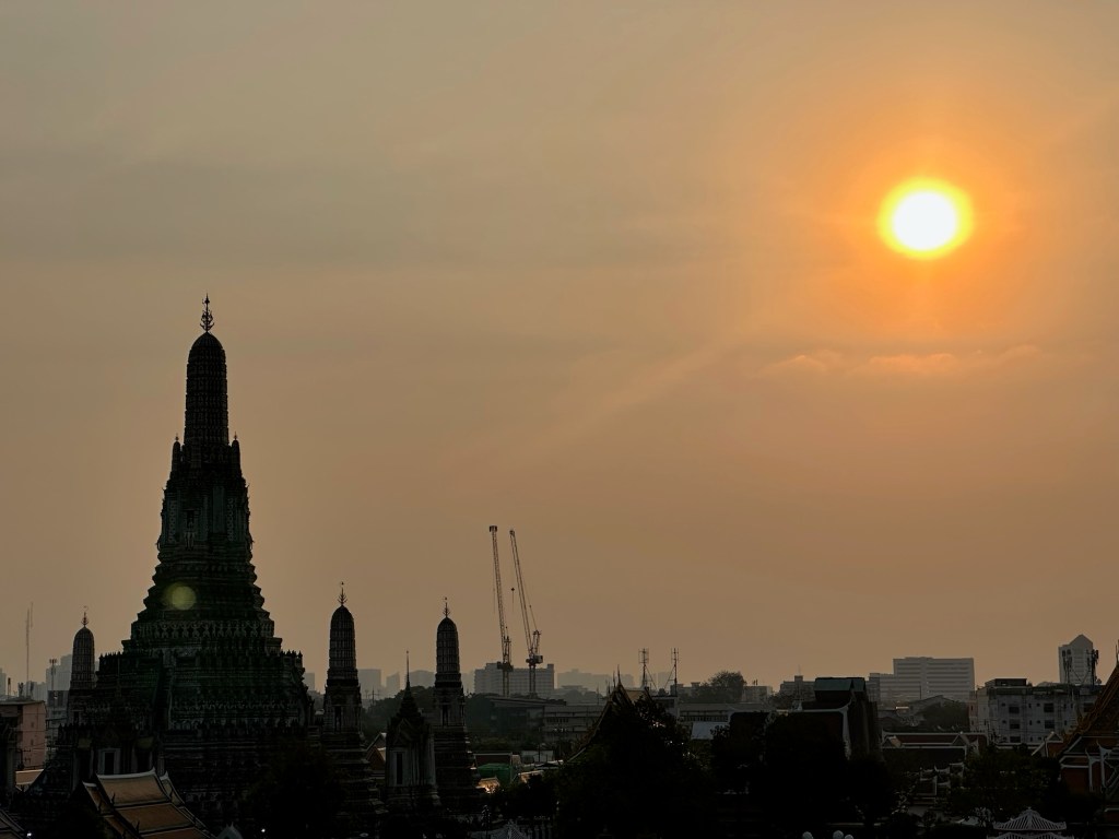 Pour combattre le décalage horaire, nous décidons d’aller voir le coucher du soleil sur une des nombreuses terrasses qui font face au Wat Arun. Ainsi sur les berges du Chao Praya nous attendons que le temple s’illumine à la tombée de la nuit. Nos têtes ont dû capituler, le corps a parlé. Marie, appuyée sur sa main, presqu’endormi alors que l’énergie de Seb baisse à vue d’œil.