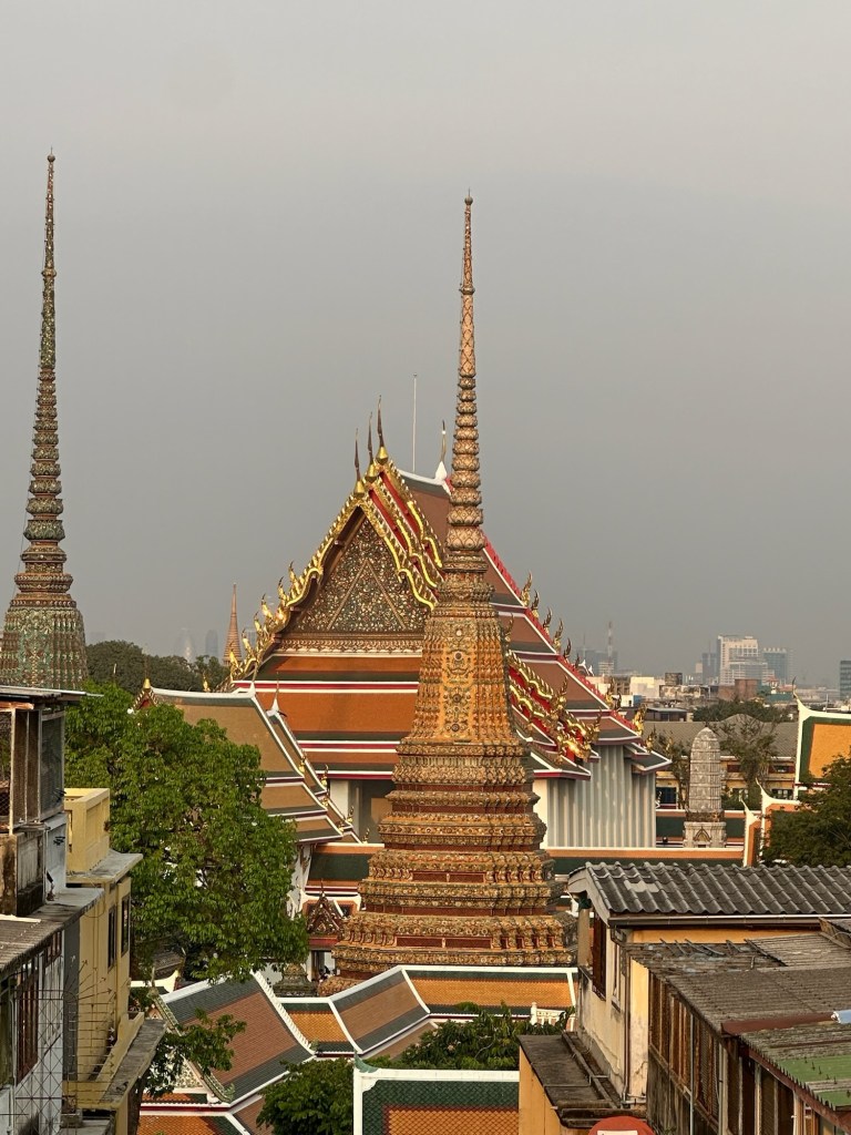 Sur une note plus triste, nous observons à partir du toit de notre hôtel, l’épais brouillard de pollution qui recouvrent la ville. En fait la presque totalité de la Thaïlande en souffre cette année: il semble que l’amalgame entre l’accroissement des activités humaines et les feux de broussailles en soit la cause. Quoi qu’il en soit le panorama qui donne sur la ville et la piscine rafraîchissante nous offre tout de même un atterrissage toute en douceur!