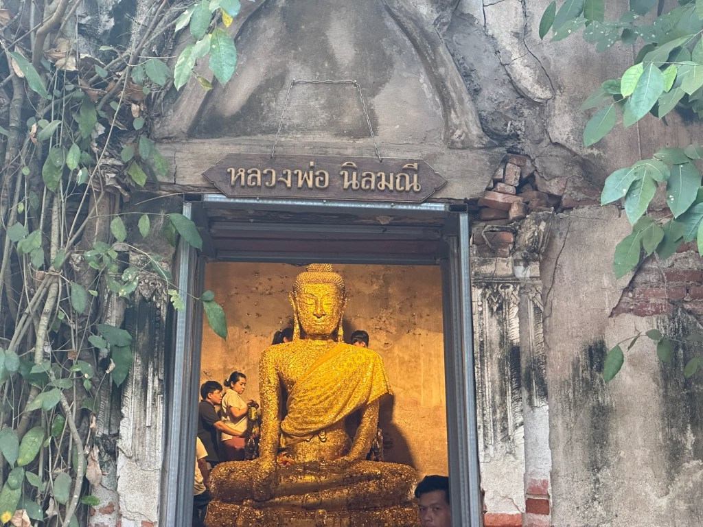 Notre guide nous accorde un petit arrêt dans un temple thaï qui se cache à travers les racines d’un vieux Banyan Tree. À l’intérieur un bouddha géant sur lequel nous allons déposer des feuilles d’or en guise de recueillement. Le temple commémore la bataille d’Ayuthaya qui opposait les birmans aux Thaïlandais au 18ieme siècle.
