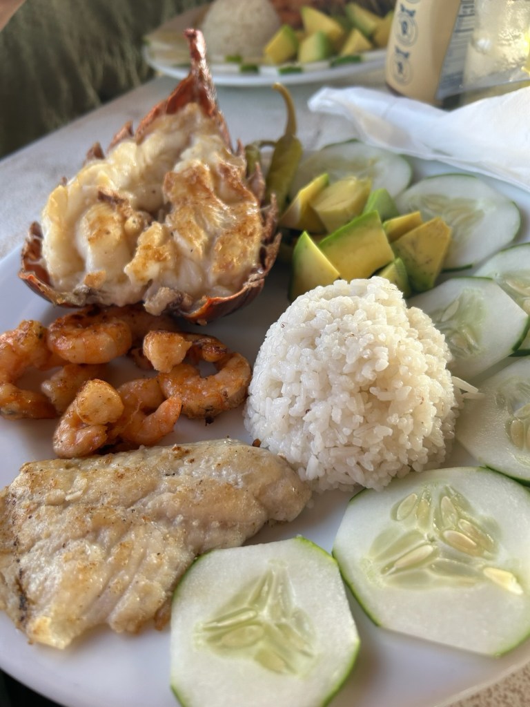 On y a commandé l’assiette classique, l’unique menu du restaurant en fait: languouste grillée, crevettes et poissons frais. L’assiette était servie avec des avocats frais et des tranches de concombres. Dans un espagnol un peu rouillé, on commande 2 bières Cristal Extra chacun et la facture monte rapidement à 91$USD. Il aurait été mieux de demander le prix avant de commander afin de confirmer le prix et surtout si c’était en dollars canadien ou en dollars américain. car au moment du paiement, le prix par assiette n’était plus de 15$ comme on avait lu dans certains blog sur le web mais bien 30$.